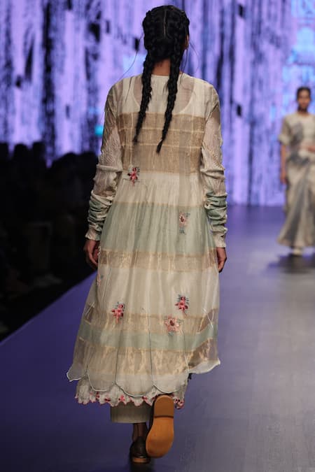 Feel comfortable in this contemporary look for a get-together party. This beige & green flared kurta features Parsi embroidery with pintuck detail. It comes with an inner.