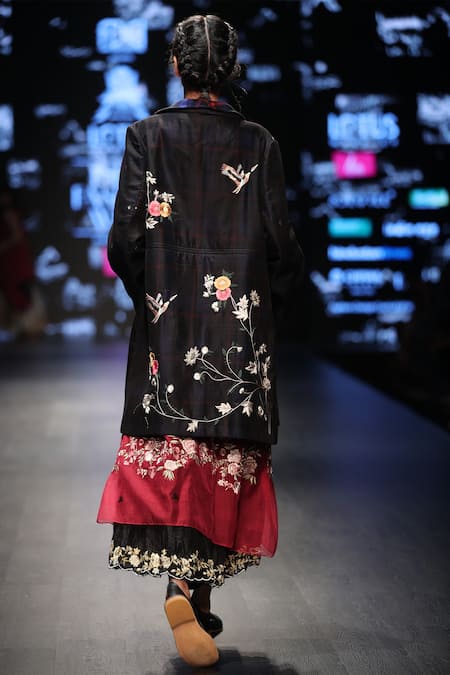 Prama By Pratima Pandey_Maroon Tissue, Pashmina Floral Embroidered Open Kurta With Jacket_Online_at_Aza_Fashions