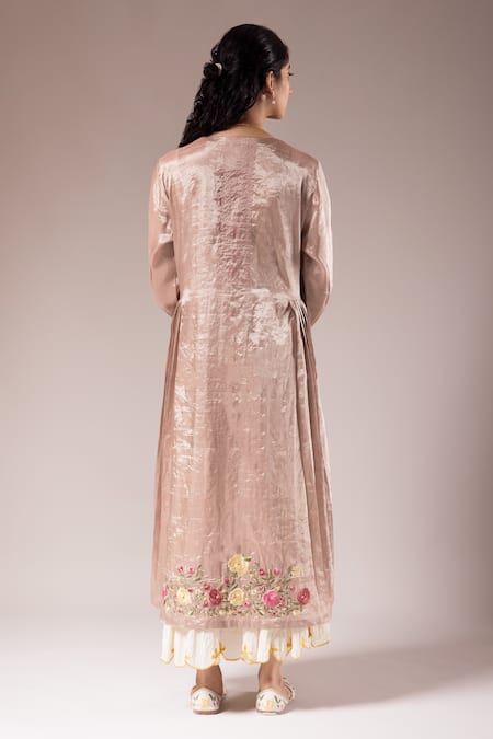 Pink Tissue Embroidery Parsi Floral Round Kurta With Inner Dress