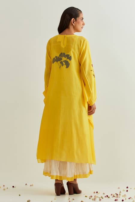 Yellow chanderi dress featuring floral and leaf hand block print with a round neckline. Paired with an ivory inner garment and puffed sleeves.