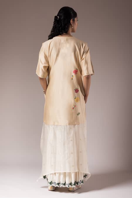 Beige half sleeves asymmetric kurta in silk chanderi with floral blossom hand paint. Paired with an ivory crushed cotton inner dress featuring flora vine embroidered border.
