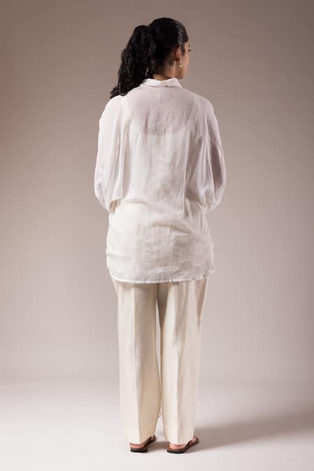 White handloom cotton shirt featuring a tie-up neckline and full sleeves. Paired with cotton flared pants with a scalloped hem detail.