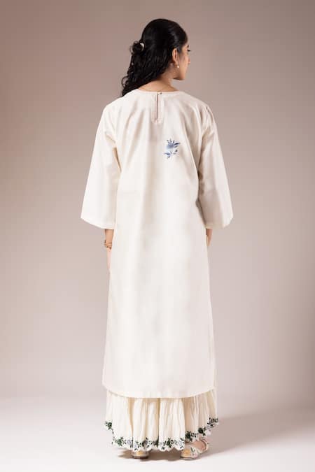 Ivory kurta featuring three fourth sleeves and iris bloom hand-painted details. Paired with an ivory crushed cotton inner dress adorned with a flora vine embroidered border.