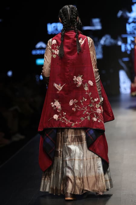 This pleated gold and grey lehenga set that comes with an embroidered belt and a woolen jacket is an epitome of understated grandeur.