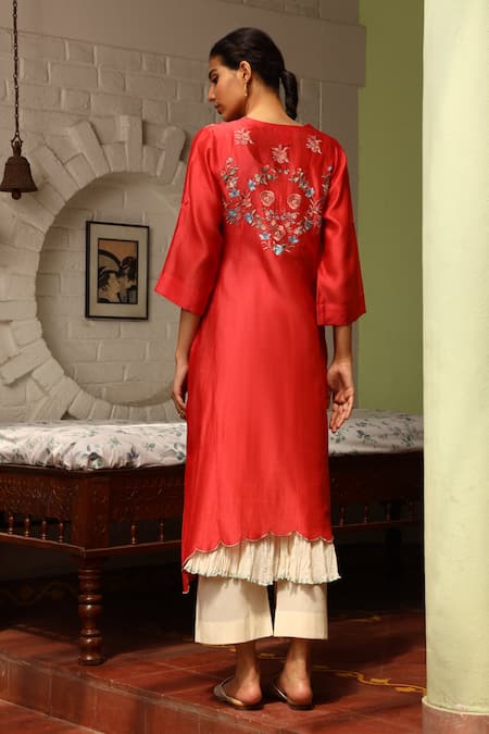 Red handwoven silk chanderi embroidered kurta with placement parsi embroidery, V-neckline & scalloped hem. Paired with cotton anarkarli style embroidered hem inner & palazzo.