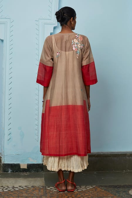 Maroon, grey tunic with floral embroidered motifs, front button placket & contrast panel. Paired with anarkali style inner.