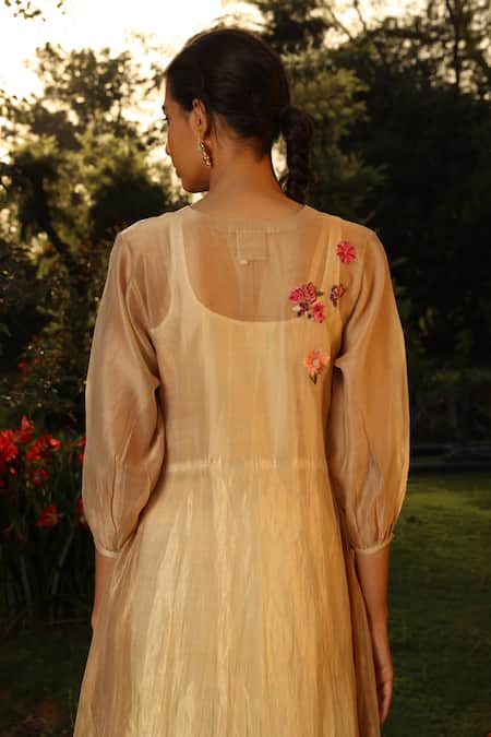 Half beige, half gold zari handwoven silk maheshwari flared kurta with floral motifs in thread embroidery & bishop sleeves. Paired with cotton hand-crushed inner & palazzo.