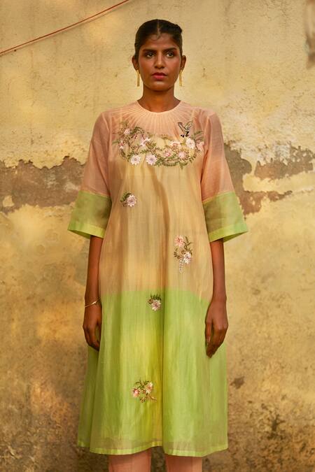 Peach, lime green tunic with hand embroidered floral motifs & pintucks detail.