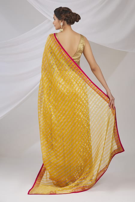 Yellow Chanderi saree with all over silver stripes & pink silk border.