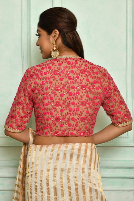 Beige Net, Lining Cotton Silk Sequin, Thread V Neck Floral Embroidered Blouse