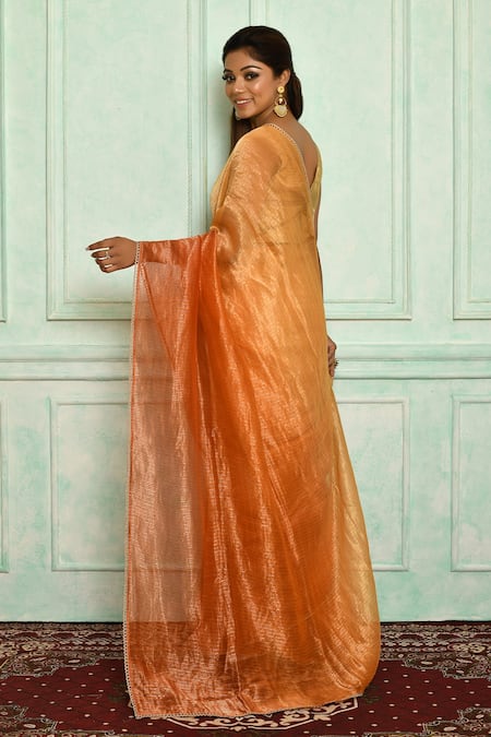 Orange & yellow shaded chanderi saree with gold, silver stripe pattern & lace border embellishment.