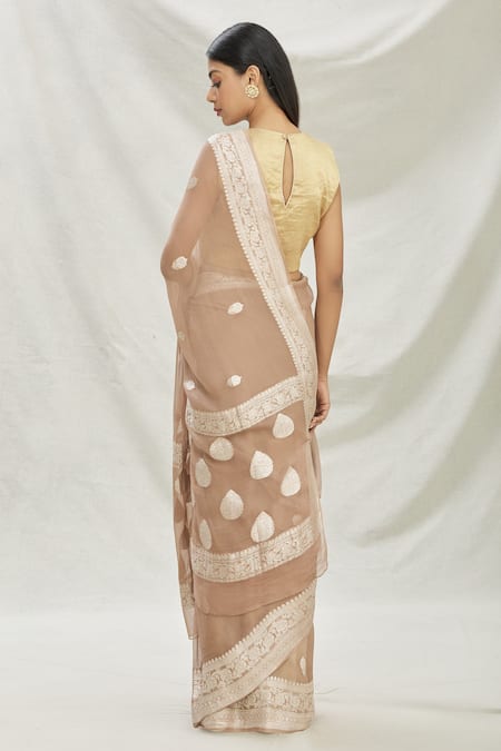 Brown saree with silver zari woven motifs on the base of georgette & kadhwa banarasi fabric.