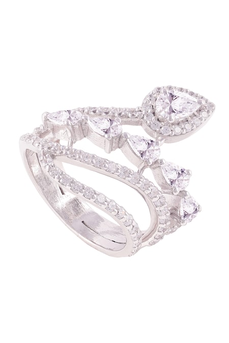 White gold plated wave ring crafted in 925 sterling silver featuring pear and round cubic zirconia stones