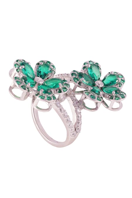 Green floral ring crafted from 925 sterling silver and white gold plated