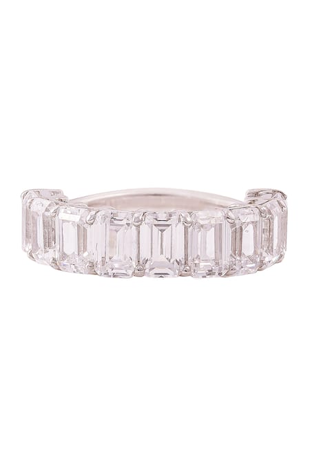 White plated ring featuring emerald-cut cubic zirconia stone embellishments
