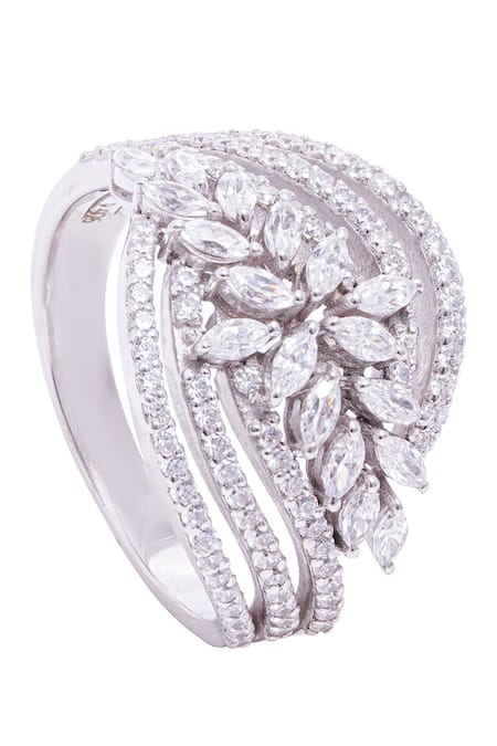 Adorned with marquise stones in a leaf pattern, Three lines of small round stones in swirl pattern, White rhodium plating for added shine