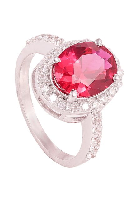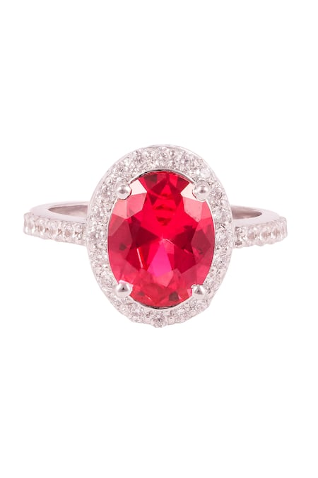 Red ring featuring an oval red stone surrounded by a halo of round-cut cubic zirconia