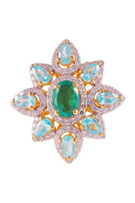 Studded with an oval green center stone, Aqua pear-cut stones around the center, Gold plated finish with intricate floral design
