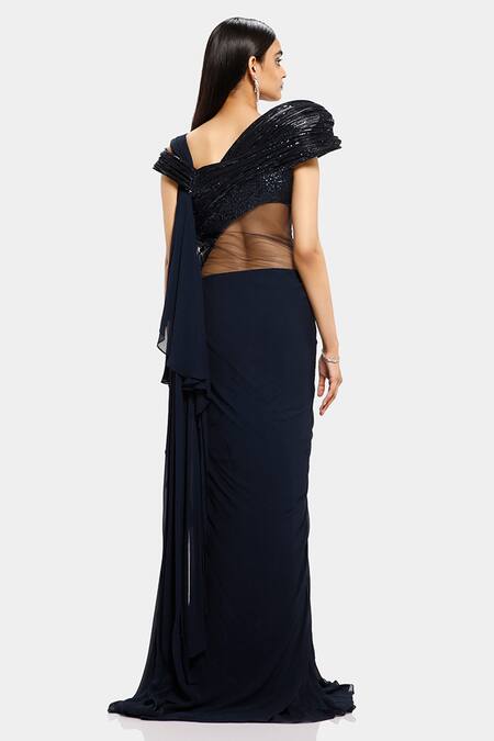 Midnight blue pre-draped saree gown with placement sequin embroidery, sculpted shoulders & waist cutouts sheer panel.