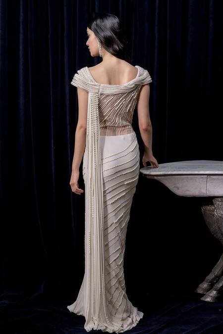 Buy_Gaurav Gupta_White Silk Georgette Pre-draped Embroidered Saree Gown_Online_at_Aza_Fashions