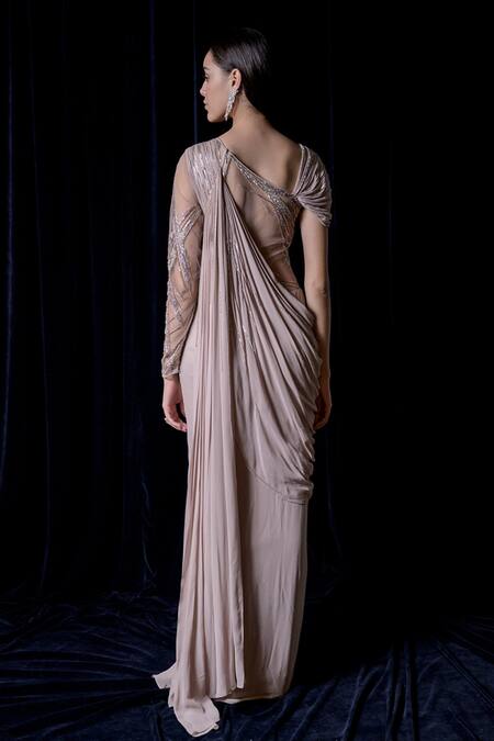 Nude pink pre-draped saree gown with dramatic shoulder, sheer panel & placement bead embellishments.