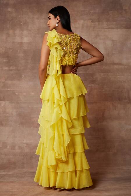 Sunshine yellow pre-stitched saree with layered ruffles. Paired with sleeveless blouse in mesh tasselled in sequins