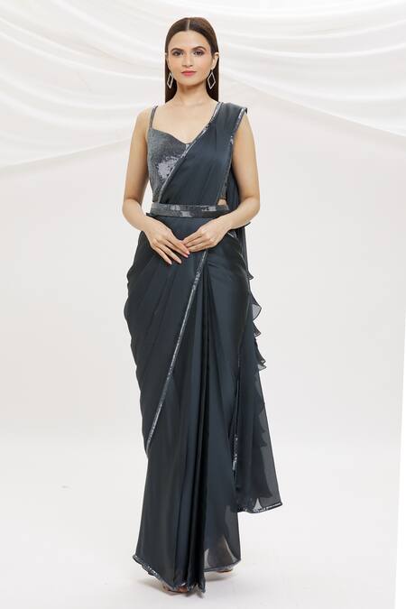 Charcoal grey pre-draped ruffle saree. Comes with tube embroidered padded blouse & belt.