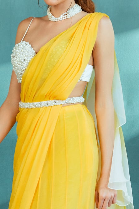 Yellow chiffon pre-draped saree with ombre ruffled palla. Paired with ivory heavy pearl embroidered bustier and embroidered belt.