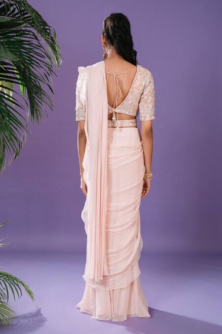 Peach georgette pre-draped saree featuring ruffles and embroidered detailing. Paired with an organza silk blouse adorned with crystals and cutdana work.