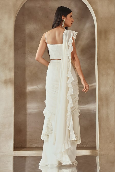 Ivory Georgette, Organza Embroidery, Pre-draped Ruffle Saree With Blouse