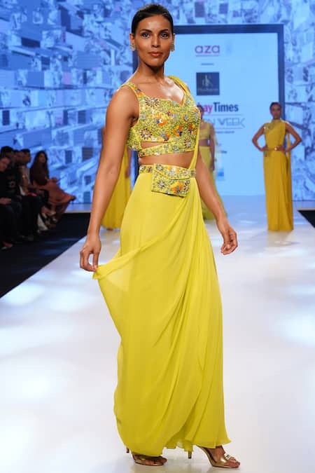 Yellow pre-draped skirt saree paired with embellished sleeveless blouse. Comes with embroidered bag belt.