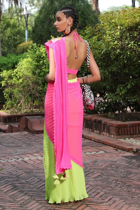 Totiya lime pre-draped colorblock saree with hot pink pleated palla, floral applique on shoulder and scalloping detail border. Paired with hot pink blouse.