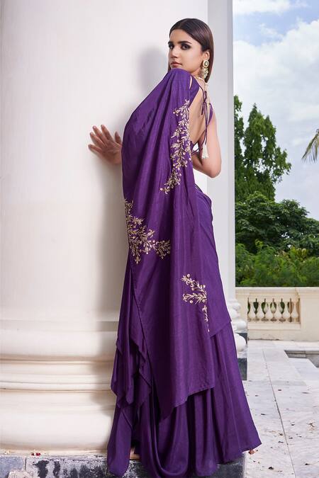 Purple pre-draped skirt-saree with nakshi, sequins, zari worked floral motifs. Comes with embroidered sleeveless blouse & belt.