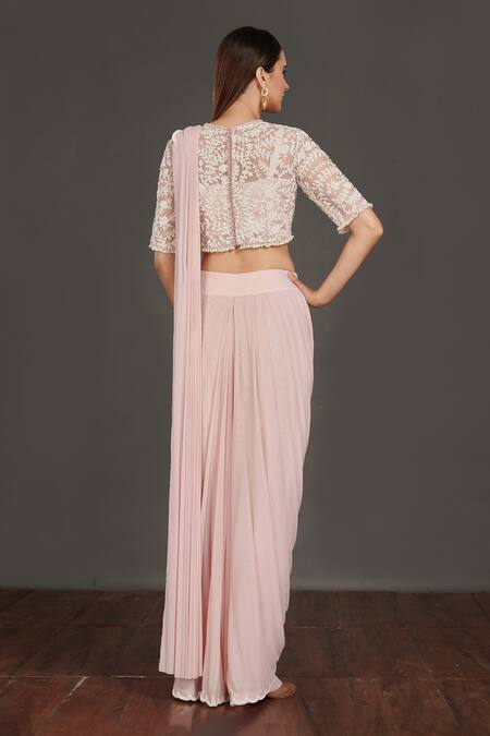 Pink pre-draped saree with moti embroidery on the border. Comes with embroidered blouse.