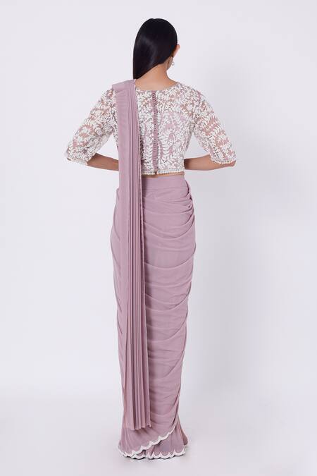 Mauve pre-draped saree with moti embroidery on the border. Comes with embroidered blouse and belt.