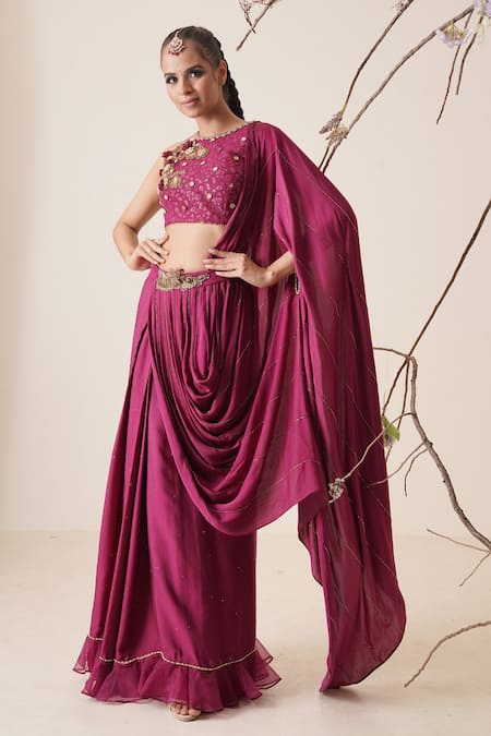 Wine Blouse Net, Inner Embroidered, Lining Crepe, Saree Pre-draped With