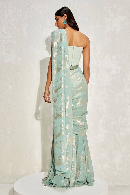 Green ombre pre-draped saree featuring shimmer foil patterns and a hand embellished corset. The saree has a pleated fabric base with kalis at the skirt bottom and a back zipper closure.