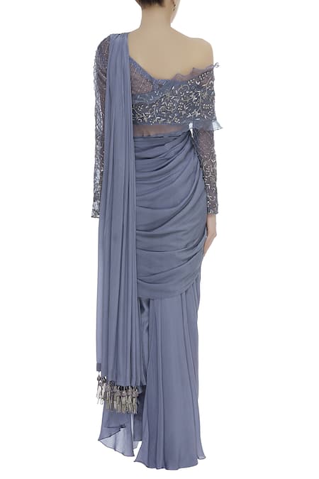 Grey Organza, Crepe Embroidered Pre-draped Saree With Embellished Blouse