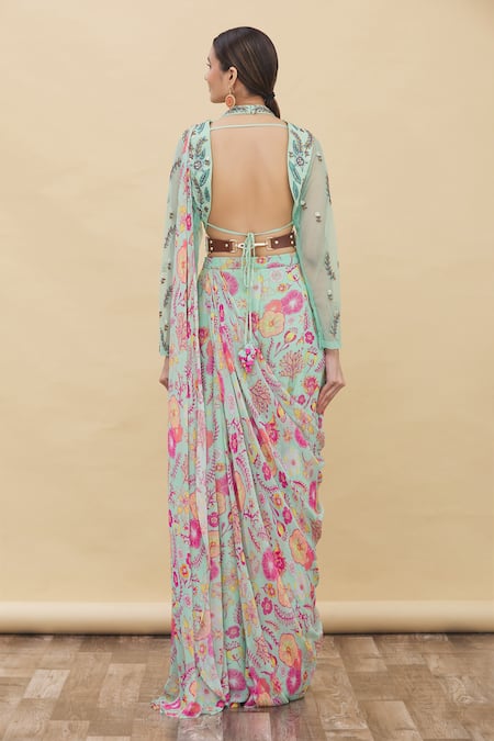 Mint green pre-draped saree with floral motif prints & attached cascading pleated palla. Comes with embroidered high-neck blouse & a belt.