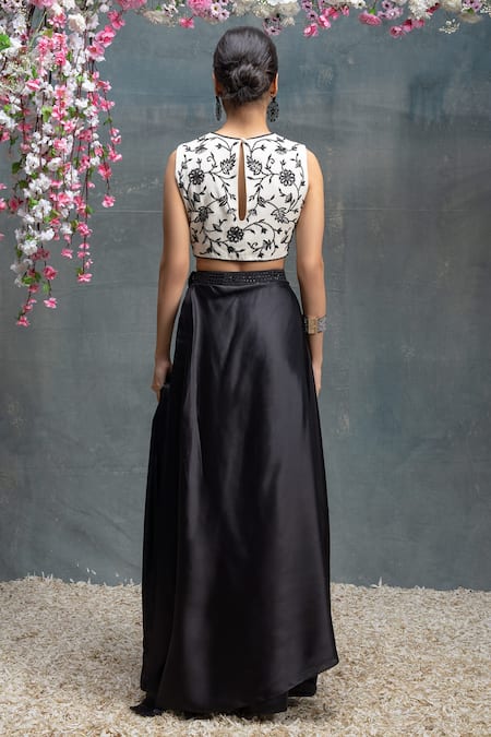 Black pre-draped saree featuring tonal cutdana and sequin embroidery on the waistband. Paired with an ivory floral embroidered blouse with a keyhole cutout at the back.