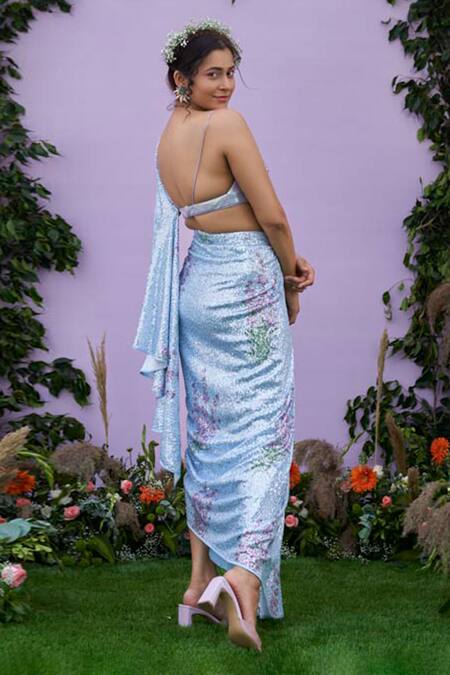 Light blue pre-draped saree featuring sequin embellishments and lavender print. Paired with a padded blouse with a sweetheart neckline.