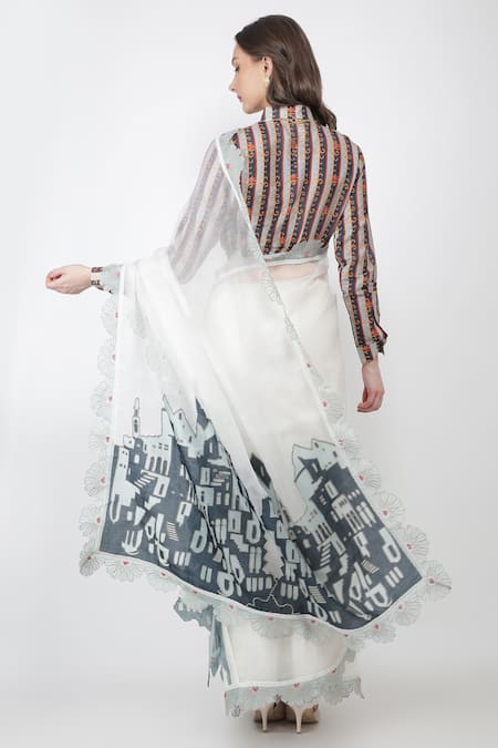 Ivory saree with teal fort embroidery and floral detail on the border. Comes with striped crop top.