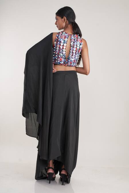 Black pre-stitched dhoti pant saree featuring an asymmetric hem and back keyhole detailing. Paired with a floral embroidered blouse adorned with pearls and shell sequins.