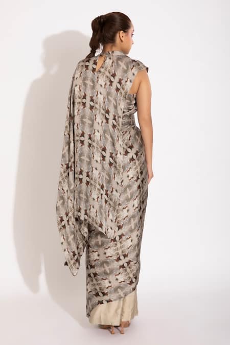 Studio Surbhi_Grey Georgette, Satin Cut Work, Pre-stitched Illusion Print Saree With Blouse_Online_at_Aza_Fashions