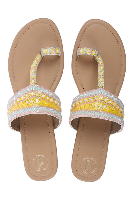 Beige Kolhapuri sandals featuring hand embellished pastel beads and toe-ring design