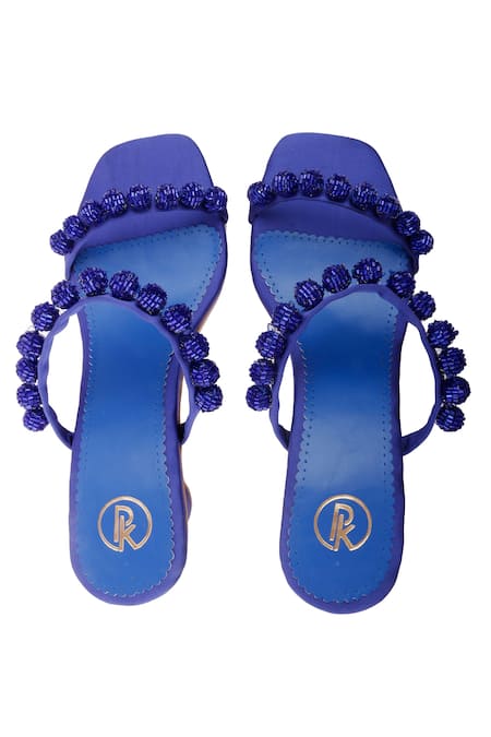 Blue block heels featuring cutdana embroidered hand-stitched balls on straps with an open toe design