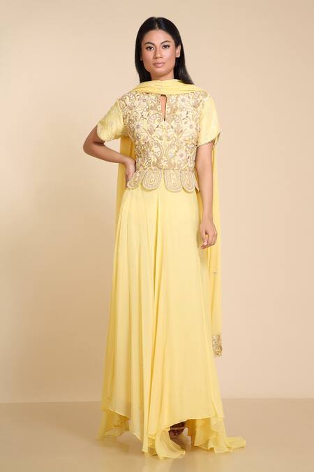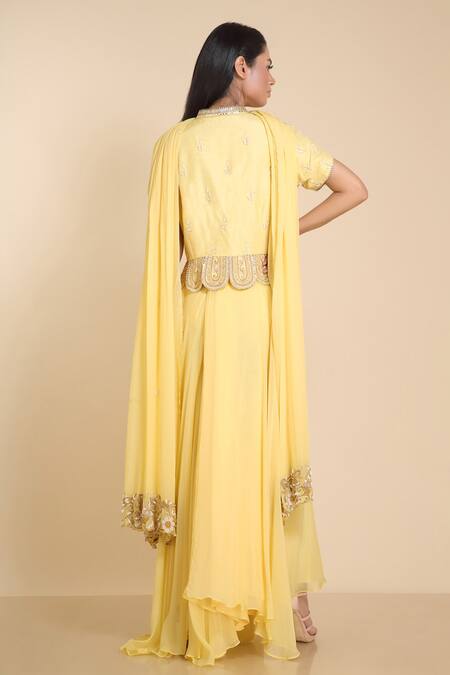 Yellow Georgette Silk Mandarin Collar Asymmetric Lehenga Set