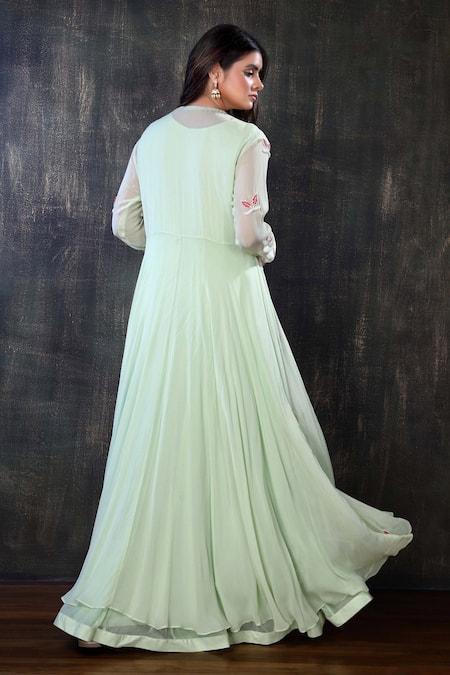 Mint green jacket with moti & floral embroidery. Paired with inner & straight pant.
