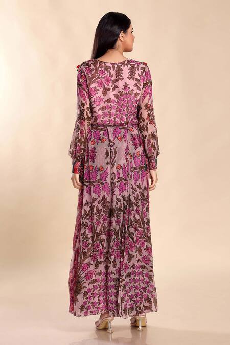 Multicolored floral print top featuring folklore embroidery and long cuff sleeves. Paired with a box pleat sharara, both crafted in chiffon with an attached lining.