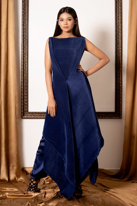 Indigo blue sleeveless draped dress featuring pleated detailing and an asymmetric hem. Paired with matching pants for a complete look.